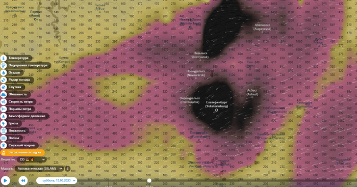 У ventusky есть раздел где можно посмотреть карту загрязнений. При горении выделяется много углекислого газа, и на карте это очень хорошо видно. Посмотреть можно и загрязнения по другим показателям.