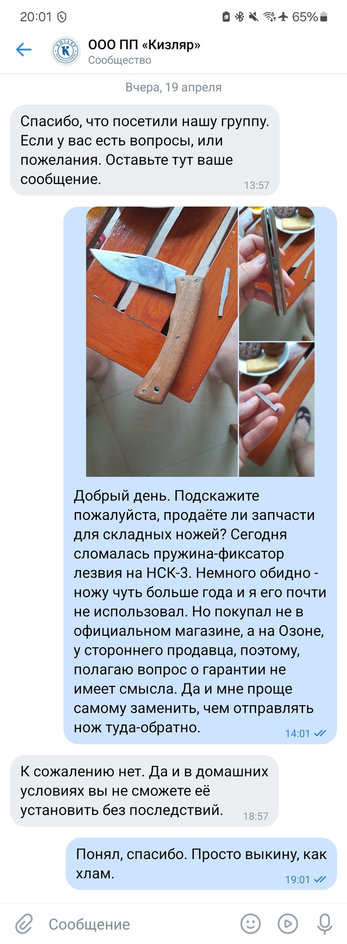 Вот те на те, хрен в томате! Не выдержав невыносимой тяжести бытия фиксатор лезвия покинул этот хмурый мир с печальным хрустом. Удивлению моему, как и разочарованию, а так же негодованию не было предела. В общем, бурую эмоций испытал, в связи с данным прискорбным событием, так как дюже не люблю, когда подводит инструмент, тем более такой примитивный. Посидел с ощущением легкого непонимания - то ли сила сталеваров из плавок вытекла, то ли просто мне не повезло. Думаю, а напишу-ка я производителю. А ну как может запчасть продадут. Заменю, да буду дальше пользоваться. Ну, и, не мудрствуя лукаво, написал.