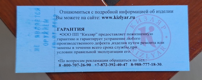 В доказательство, что купил не подделку (хотя вообще кому в голову придёт идея подделывать дагестанские ножи за 2 т.р.?), прикладываю фотокарточки коробки с фирменными пломбами и сертификатами, которые там лежали. Говорят, даже пожизненную гарантию обещают, но у меня она похоже мимо прошла - ибо неча у всяких ИП с Озонов дешевле покупать. Ишь, чего удумал экономист хренов.