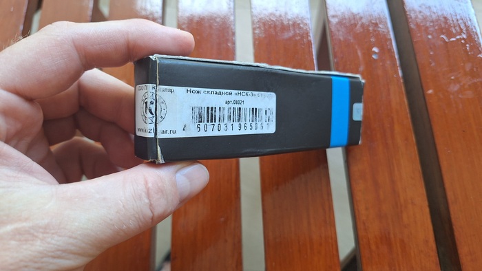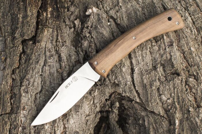 Однако время шло и я возжелал чего-то большего. Буквально. То бишь захотел купить перочинник покрупнее, чтоб брать на рыбалку и всякое такое - помидорку там порезать, рыбку выпотрошить, веточку заготовить. Покурил интернеты на предмет "цена-качество" и обнаружил среди различных плюрализмов и всяческих консенсусов одну из относительно отчетливо выпуклых точек зрения, мол бери, юзернейм, смело ножички некой отечественной фирмы "Кизляр" - оно дескать, дёшево, сердито, +7 к ловкости и гомеопатическая прибавка к навыку "одноручное оружие". Я репу почесал немного и пришел к выводу, что уж ножички-то должны у нас уметь делать точно - не перевелась ещё сила в плавках у сталеваров. Нашёл канал на Ютубе этой конторы - там всё чин-чином: с убедительно-серьёзным лицевым выражением рассказывают про свои колюще-режущие поделки, рубят ветки, пилят гвозди, канаты с бумагой нарезают в канатно-бумажный салат - всё как у людей, в общем. Ну, и решил я раскошелиться. Выбрал модельку с названием НСК-3, как наиболее подходящую к моим не особо высоким требованиям. Картинку с официального сайта производителя прилагаю.