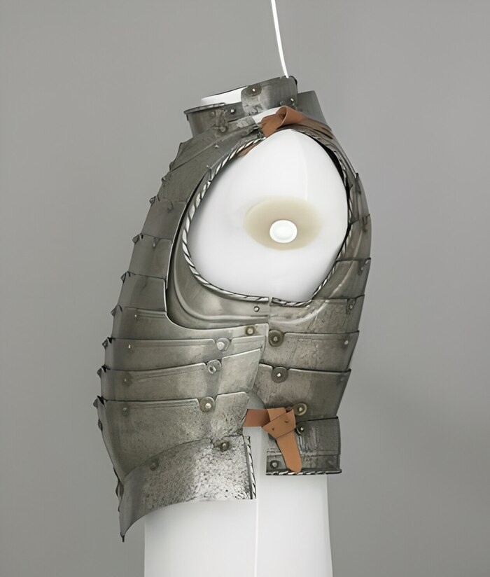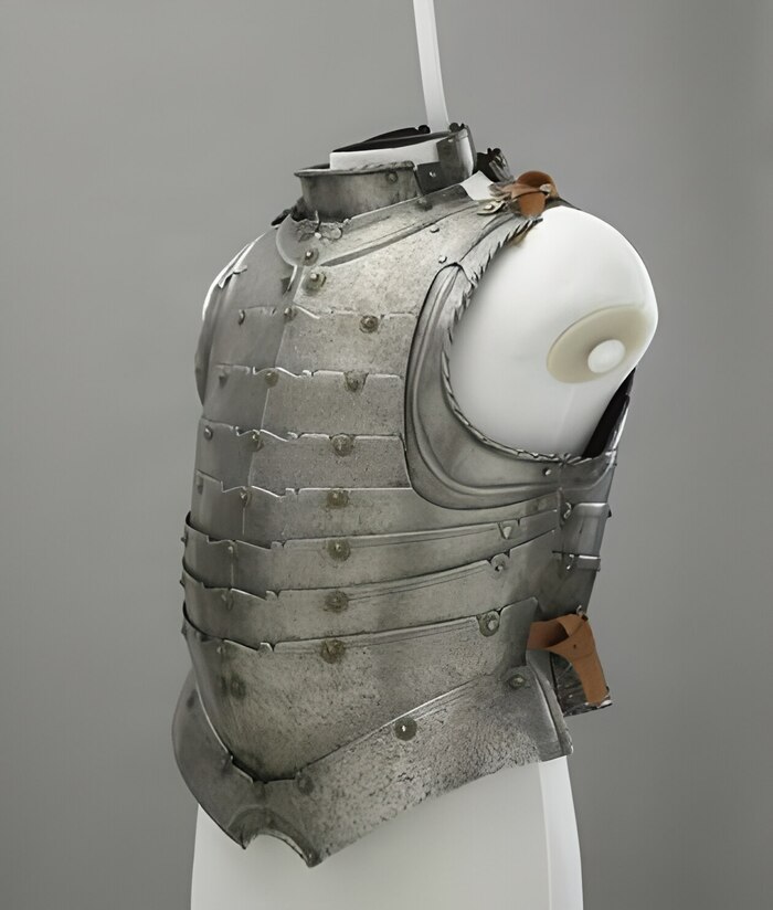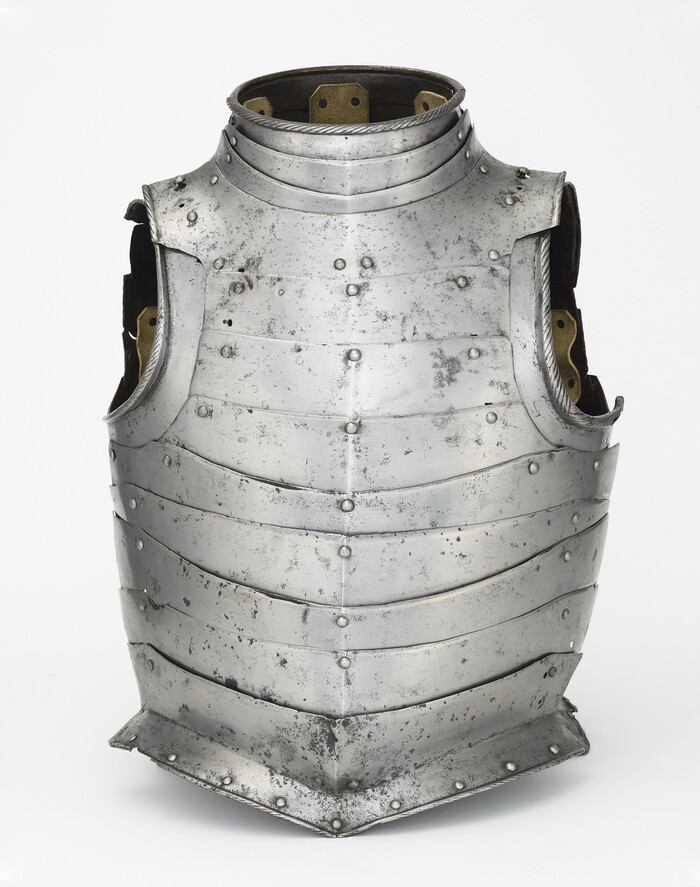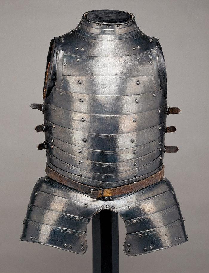 Распашная кираса, Waistcoat Cuirass, 1580 год, Италия. Имитирует дублет того времени. Состоит из трех частей, одной узкой, по центру задней части и двух боковых, которые соединяются в центре передней части.