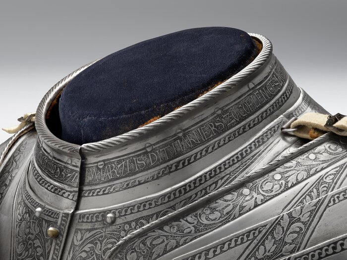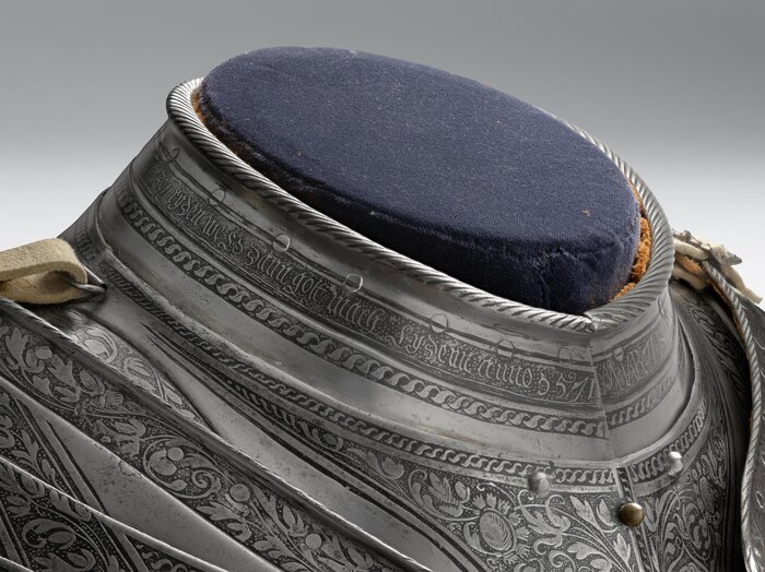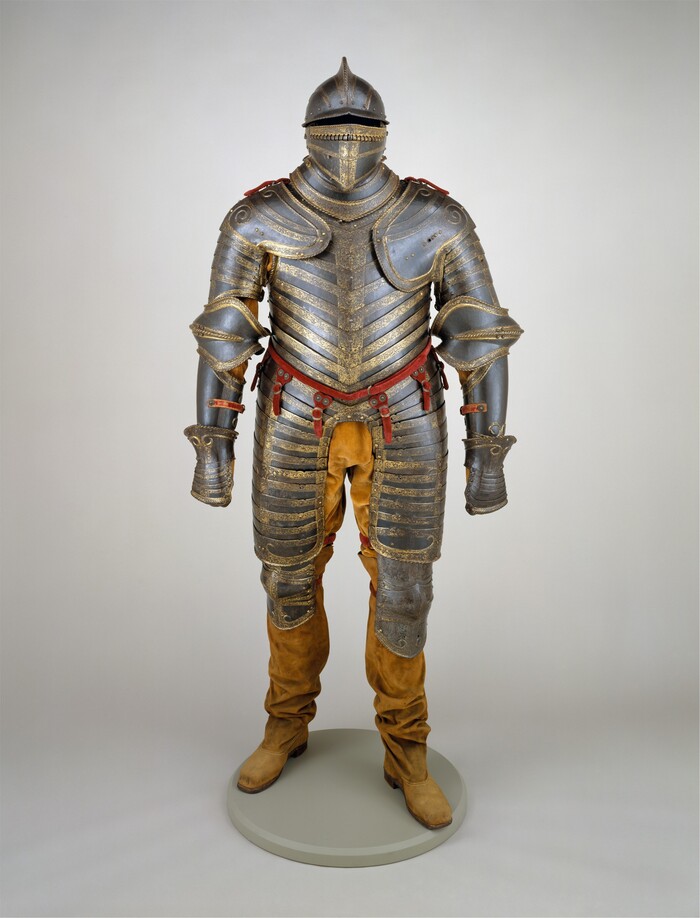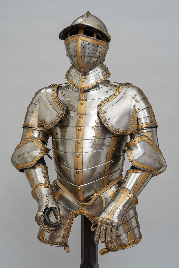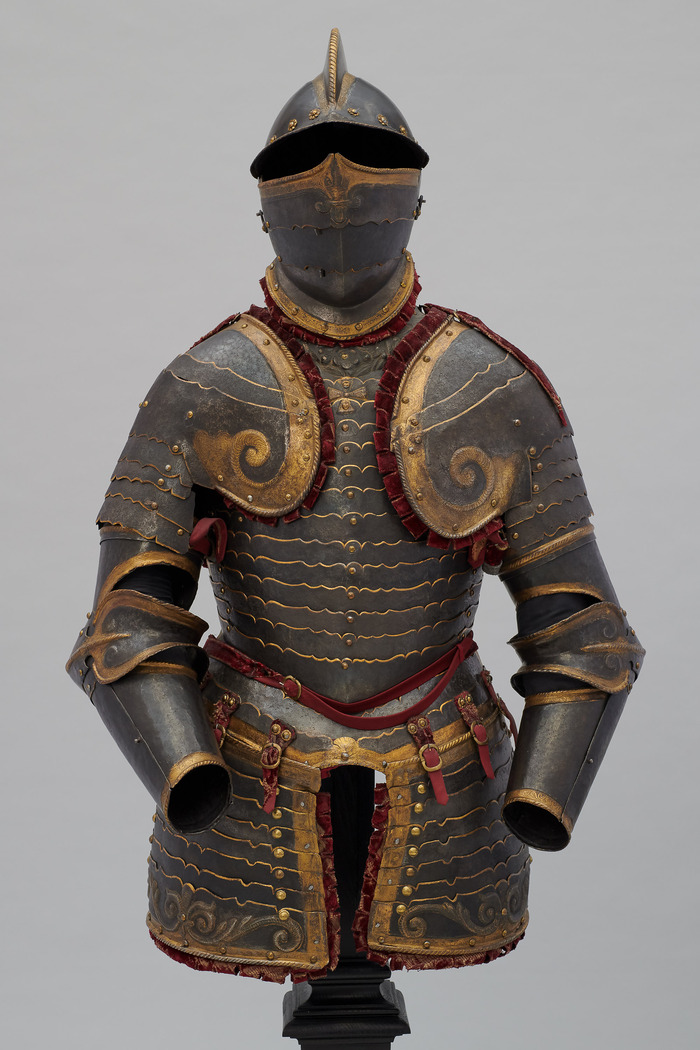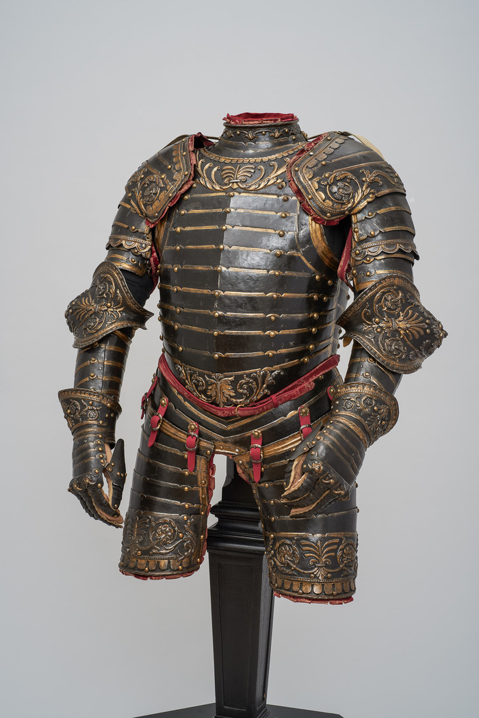 Трехчетвертной доспех с кирасой "анима", Италия, Мантуя, 1540 год, владелец Карло Гонзага маркиз Газзуоло(1510 - 1555), изготовил Каремоло Модроне (1489 - 1543). Сталь частично гравированная, частично черненая, частично позолоченная, частично посеребренная. Розетки: латунные. Заклепочные колпачки: латунные, позолоченные. Кожа (частично современная). Пряжки: железные, частично позолоченные. Текстиль: шелковый бархат, лен (современный).