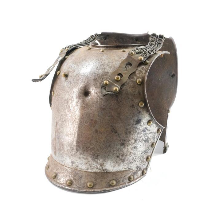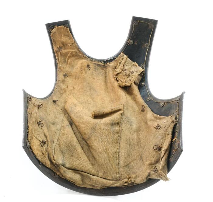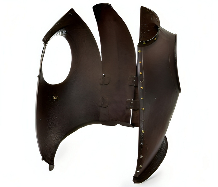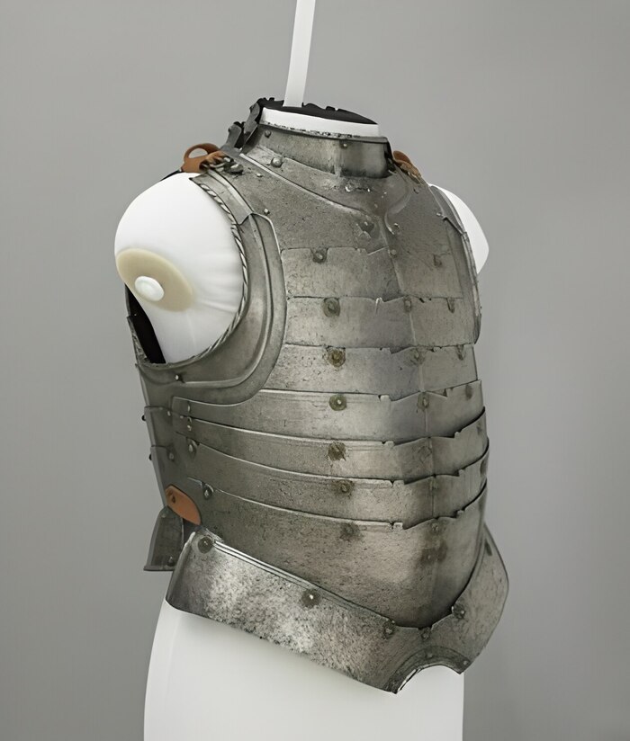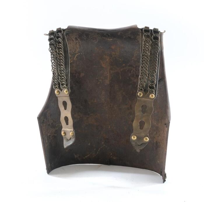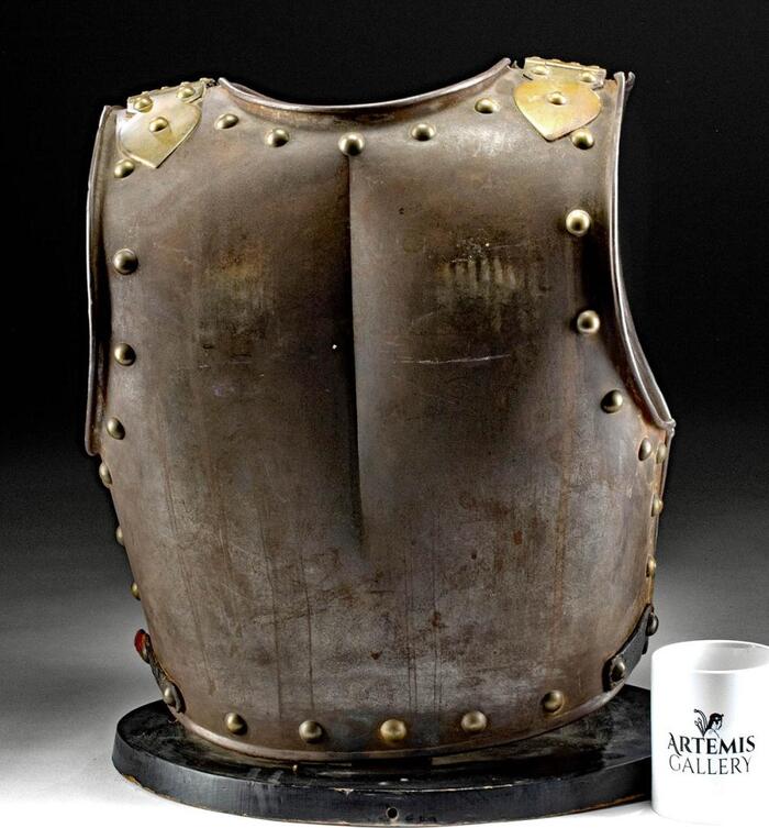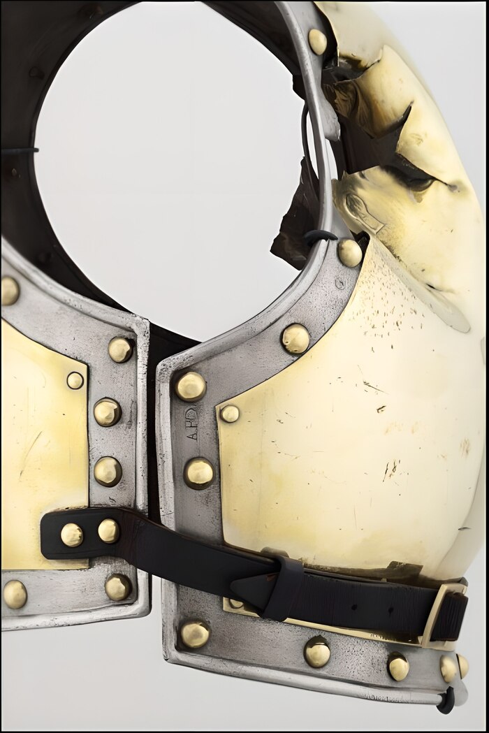 Передняя часть украшена серией накладных пуговиц, выполненных из железных заклепок с латунными колпачками. Кираса надежно закрывается с помощью двух резьбовых шпилек на внутренней пластине, которые входят в отверстия на внешней пластине. Вес 12,114 кг.