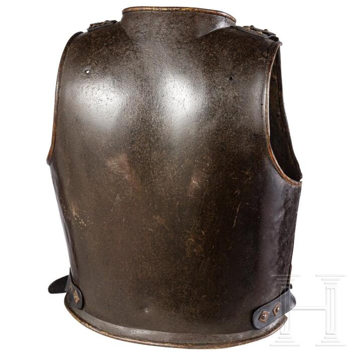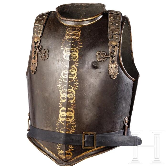 Кираса, Италия, конец 17 века. Высота 50 см, вес 13, 4 кг. Аукцион Hermann Historica GmbH, Германия. Вмятина от мушкетной пули - след теста на пуленепробиваемость. Декоративное золочение в коронованных змей, возможно, указывает на семью Сфорца.