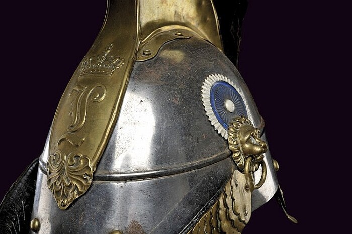 Кираса и шлем, Бавария, конец 19 века. На шлеме маркировка "748 / C1 / 5E 1872" и монограмма "L" короля Людовика II. Czerny's International Auction House.