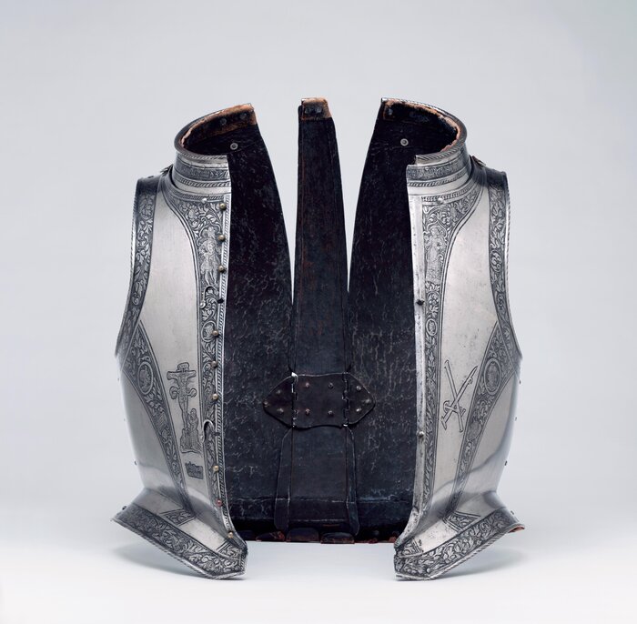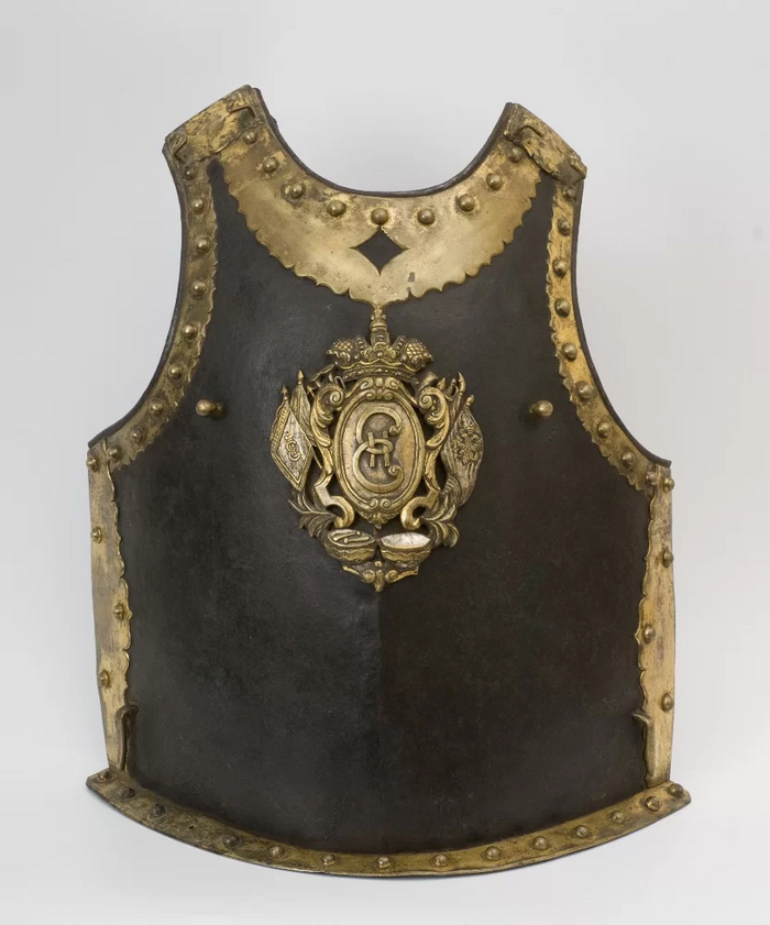 Кираса, конец 17 века, Германия. Материал: сталь, атлас, бархат, серебряный галун, овчина, кожа, золото. Высота кирасы 41,3 см; Вес задней пластины 6577 г; Вес нагрудника 6350 г. The Metropolitan Museum of Art.