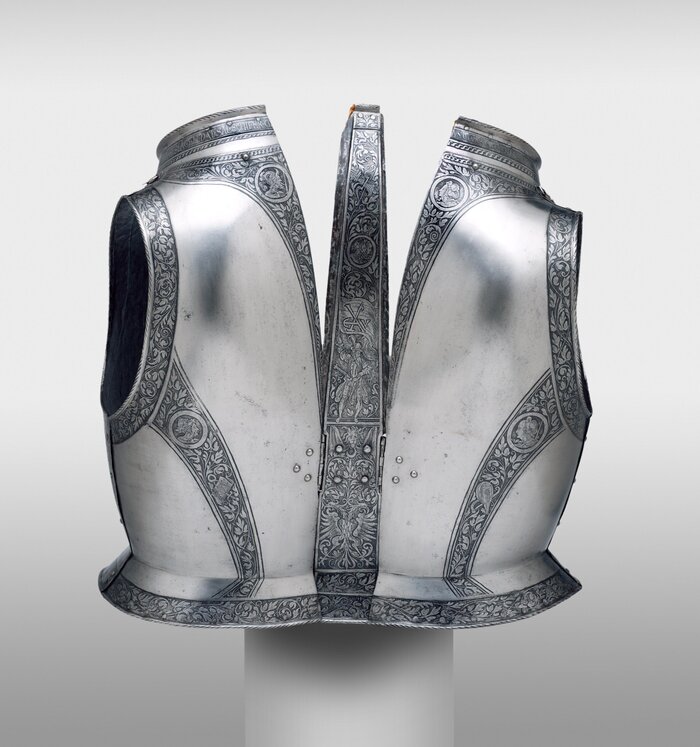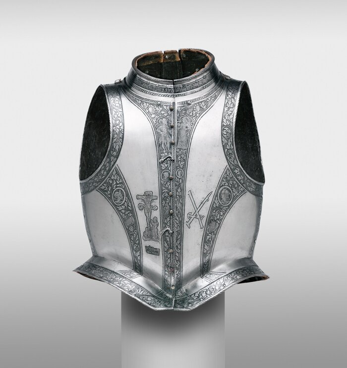 Кираса "анима", Италия, 1555 г. Владелец кирасы, Джан Джакомо де Медичи из миланской семьи Медичи (не тождественной флорентийским Медичи) сражался на стороне французов в 1526 году, но в 1528 году, в лучших феодальных традициях, перешёл на службу к Карлу V, который пожаловал его титулом маркиза Мариньяно.