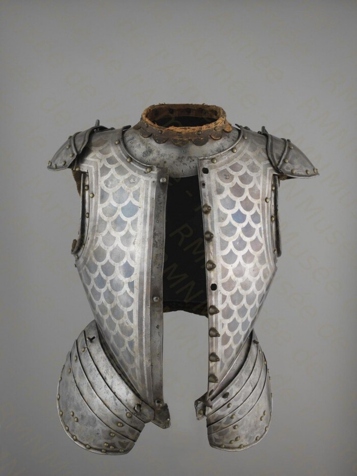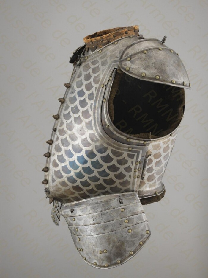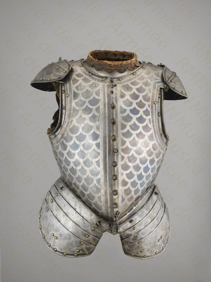 Наличие медальона с орденом св. Михаила на кирасе позволяет предположить, что этот довольно скромный доспех принадлежал представителю высшей аристократии Франции. На одной из гравюр 16 века в этом доспехе изображен дофин, будущий Генрих II, на другой коннетабль Анн де Монморанси. Рисовальщики, которые выполнили эти официальные портреты государя и его первого офицера, использовали один и тот же прототип доспеха. Однако высокий рост этого доспеха свидетельствует в пользу того, что он принадлежал все таки Генриху II, так как рост Анн де Монморанси, был меньше, что установлено по его доспехам, точно идентифицируемым с ним.