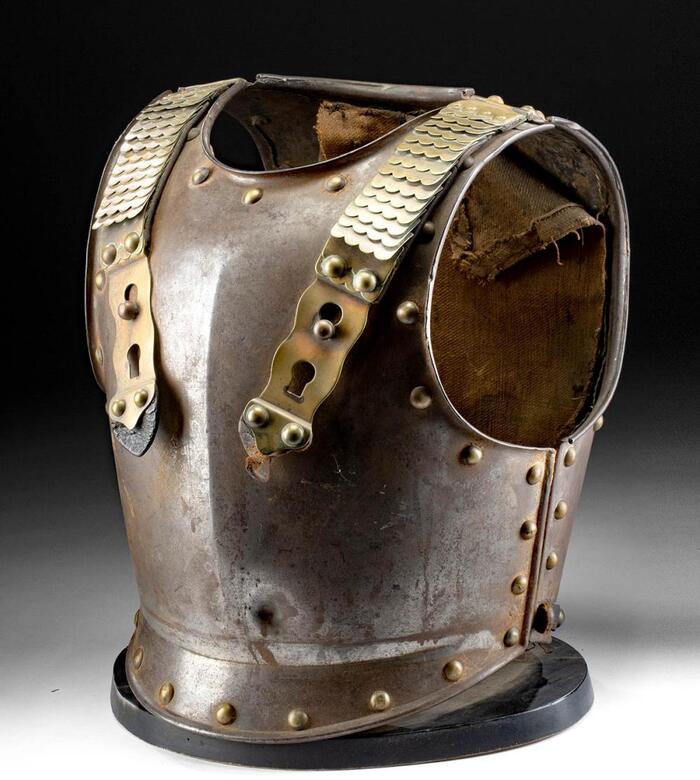 Кираса, Франция, конец 18-го - начало 19-го века. Нагрудная и задняя пластины кирасы из кованого железа скреплены латунными и кожаными ремешками. Вмятина размером с мушкетную пулю на нагрудной пластине - боевое повреждение. Размер: 33 см x 33 см x 40,6 см. Аукцион Галерея Артемиды, Луисвилл, Колорадо, США.