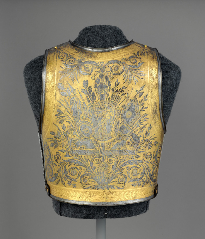 Кираса, 1825 год. Изготовлена на Coulaux Frres, Королевская мануфактура оружия Клингенталя. Дизайн разработан Франсуа-Жозефом Биш (1756-1831). Гравировка и позолота Франсуа-Ксавье Биш. Материал: сталь, золото, медный сплав, кожа. Высота кирасы 44,5 см, Вес 5505,5 г нагрудник; Вес 3642,9 г. задняя пластина. The Metropolitan Museum of Art.