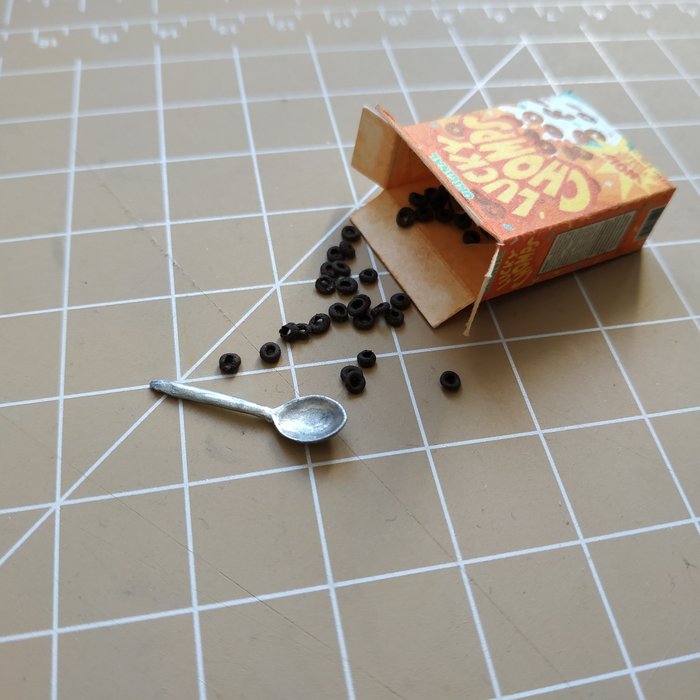 Работать над ним было здорово! Ооочень затянуло! Ложка из полимерки, упаковка хлопьев из картона (пришлось делать развёртку самостоятельно, т к готовой не было😅). Сами хлопья из полимерки.