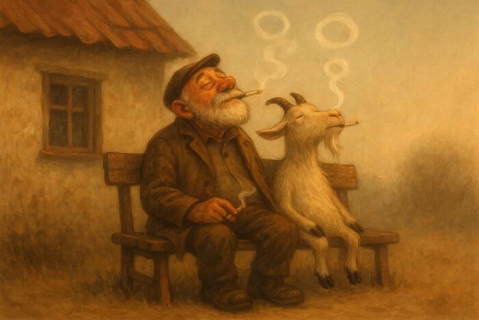 Сивохар же, был козёл не промах, сразу понял, дело пахнет чем-то куда более интересным, чем полынь. И пошла у них наука. С терпением и ломтем сахара. Ефим, как истинный гуру, учил Сивохара дымить с каким-то неземным, козлиным шармом.
