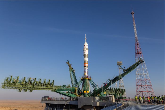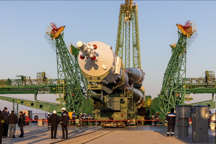 Весь масштаб ракеты-носителя с пилотируемым кораблём «Союз МС-28» с высоты птичьего полёта. Этот корабль доставит на МКС космонавтов Сергея Кудь-Сверчкова, Сергея Микаева и астронавта Кристофера Уилльямса. 🗓 Старт — 27 ноября в 12:28 мск