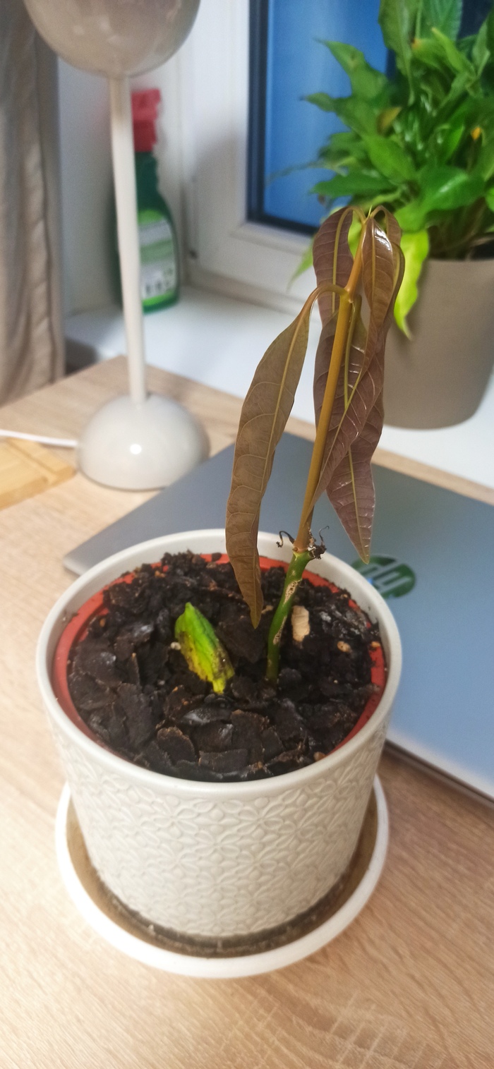 Пару месяцев назад купили манго, когда его разрезали - увидели проросшую косточку. Решил посадить в горшок. Посмотрел ролики на Ютубе, в которых показано что косточка прорастает за пару недель. Но не в нашем случае. Видимо я посадил ее вверх ногами, потому как росток появился в стороне от косточки и прорастал она на не две недели, а месяца полтора. На фото ростку манго 2-2,5 мес.