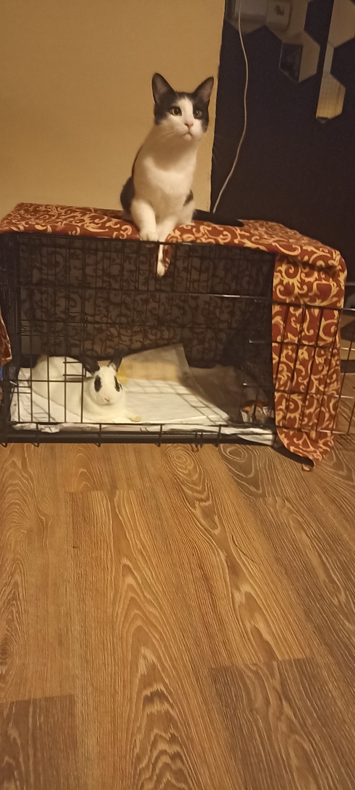 Стал экспериментировать с вольером, иногда выпуская эту бестию, чтоб сено во все стороны не летело и вообще не жить как в хлеву. Кроль зубами порой трясёт клетку как заправский зэк посреди ночи, но я уже привык и домашние тоже. Кот с кролём потихоньку стали привыкать друг к другу. Увы нет фотографий где они вместе прям в обнимку спят, но они очень сдружились. Они гоняют друг друга, когда кроль в вольере через прутья друг друга пытаются потрогать, понюхать