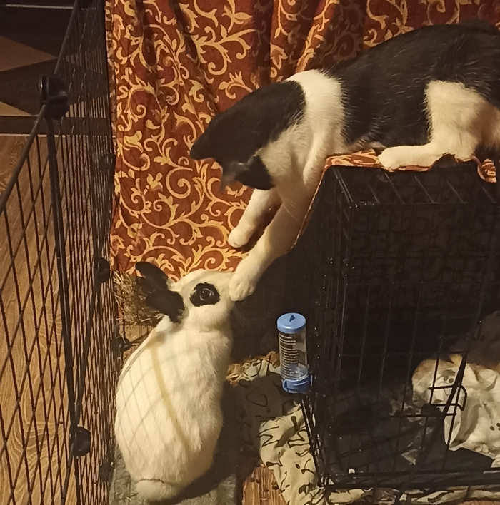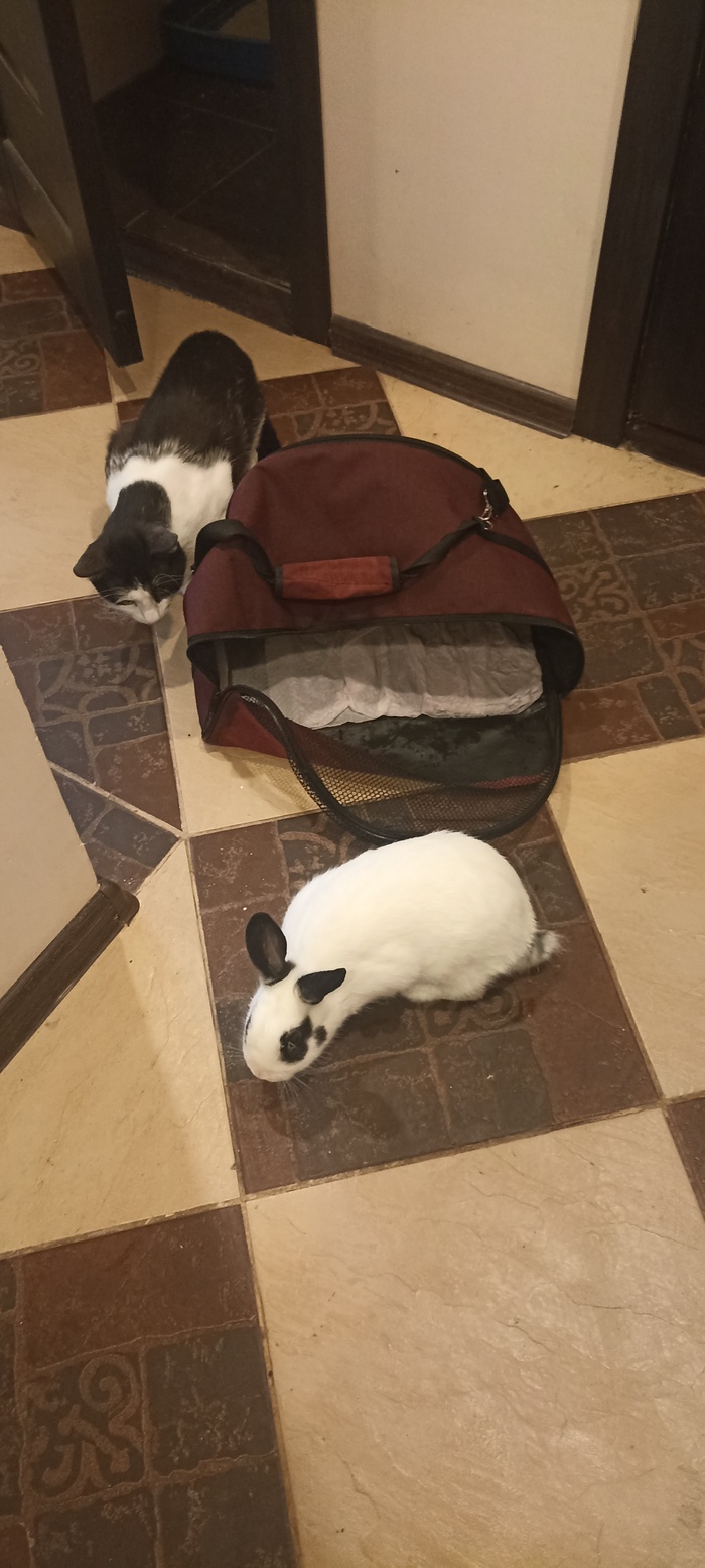 Первое знакомство было нормальным. Первые две недели были немного напряжёнными, все друг к другу привыкали. Я открывал для себя новые стороны кроликов. Я до этого смотрел разные видео, понимал про то что грызут всё, что переворачивают миски, что несквик раскидывают. Но для меня было открытием что кролик... Кролик стал гонять кота!