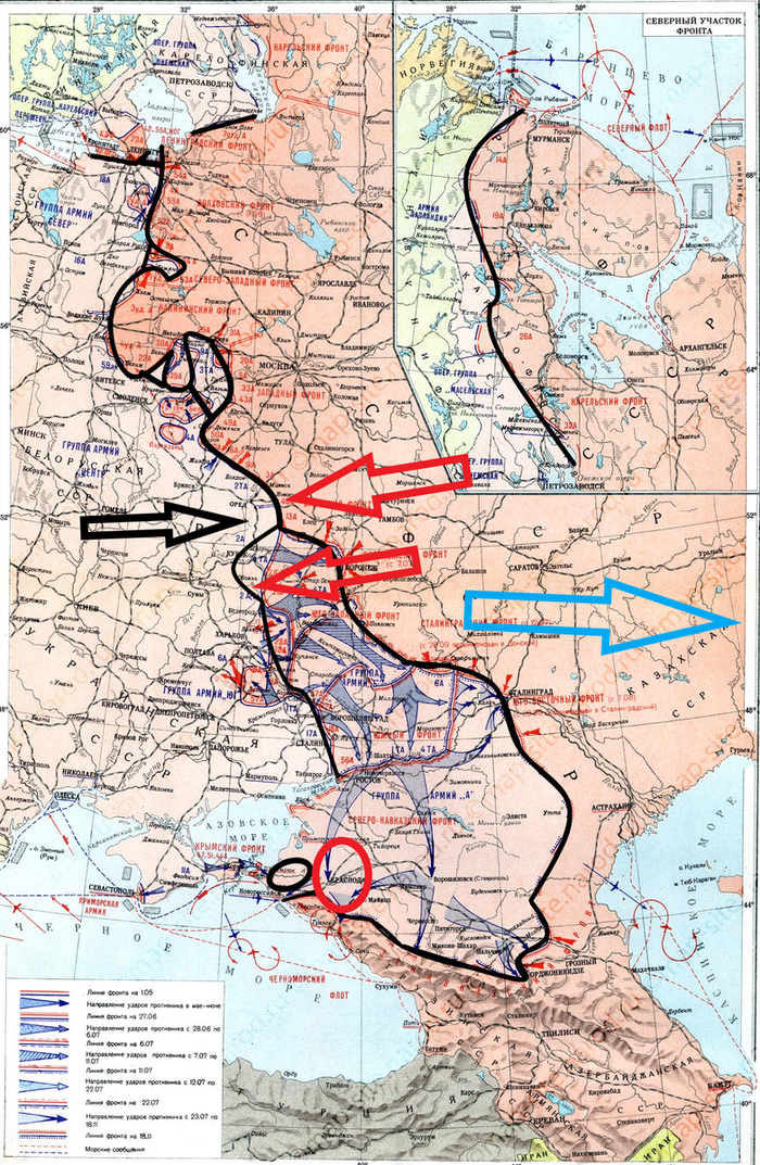 На картах красными стрелками обозначены основные удары советских войск, чёрными немецких и их союзников, голубыми направления основных событий на других театрах военных действий, жёлтыми границы отвоёванных территорий при наступлении той или другой стороны.