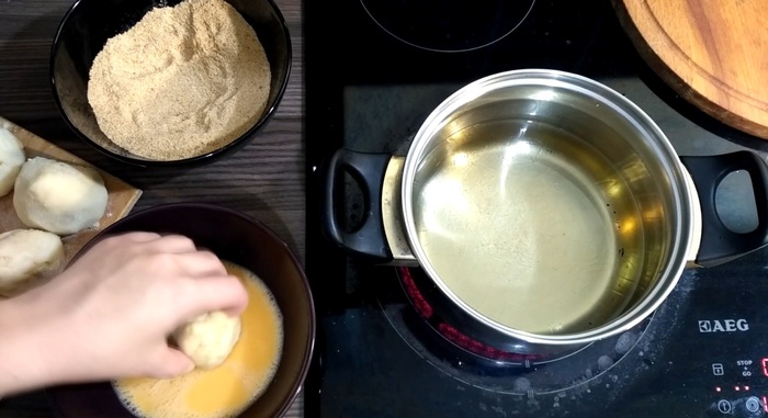 7. Взбалтываем яйца. Заготовки окунаем в яйца, затем в сухари и снова в яйца. Обжариваем во фритюре до готовности