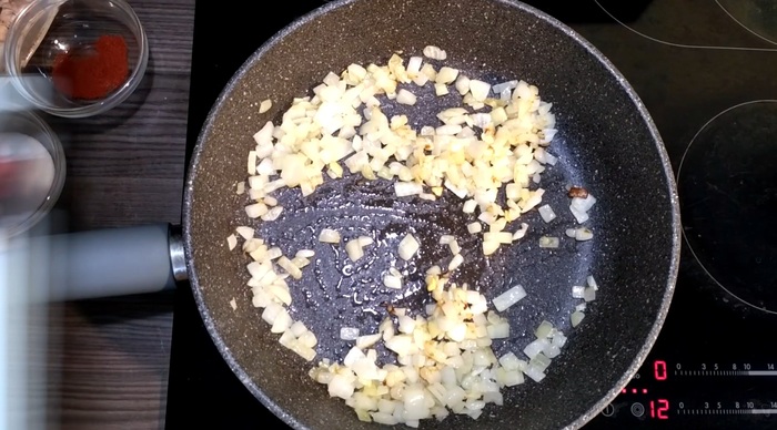 1. Мясо отделим от кости. Лук порежем и обжарим на сковороде.