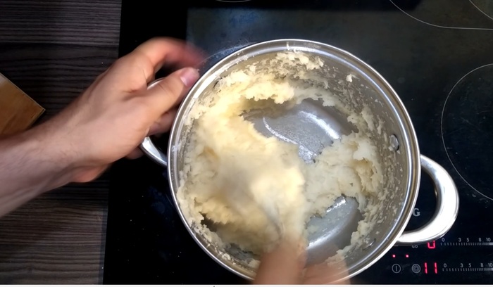 4. Добавляем муку и тщательно перемешиваем. Завариваем тесто 2-3 минуты, до тех пор пока тесто не будет отставать от стенок кастрюли. Даем немного остыть.