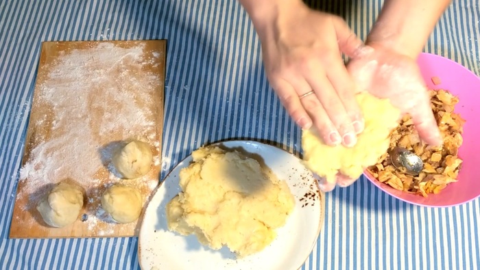 6. В центр накладываем начинку и скрепляем края, делая форму капли.