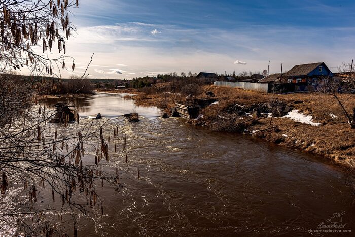 Однако, поздно. Мы уже в струе. Идём. Что-то там ждёт? Из-за поворота выплывает огромный, прямо-таки нейвинский сундук, а дальше – реденькая ольховая расчёска, а у меня в руках абсолютно новое и необкатанное весло, с непривычным диаметром шафта и безо всяких накладок на нём, отчего скользким, как рыба. Ну ладно, без больших проблем продрались. Далее решили не искушать судьбу и идти уже знакомыми путями. Скользим вдоль берегов, ещё заваленных снегом, под прячущимся за вологодским кружевом облаков и пускающим в дырки отдельные лучики, солнцем. Островов, памятных по сплаву-закрытию вовсе нет. Их все залило водой. Лишь одинокие былки кустов чертят стрелки на равномерно стремящейся вниз воде.