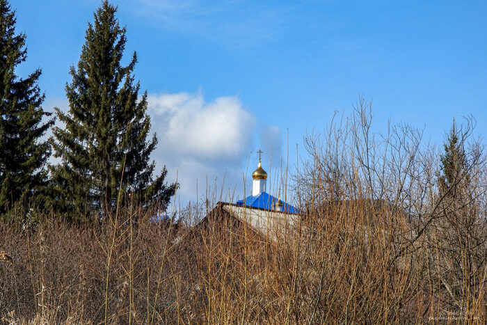 Мы двигались, справа скалы потихоньку сходили на нет, а по левому берегу уплывали нам за спину домики и огороды. На возвышенности берега, на повороте реки, мы заметили новенькую маковку церкви. А ведь осенью её ещё не было. Она ярко светилась свежей позолотой где-то рядом с местом расположения старого храма Покрова Божией Матери (дома я посмотрел, между ними всего 130 метров).