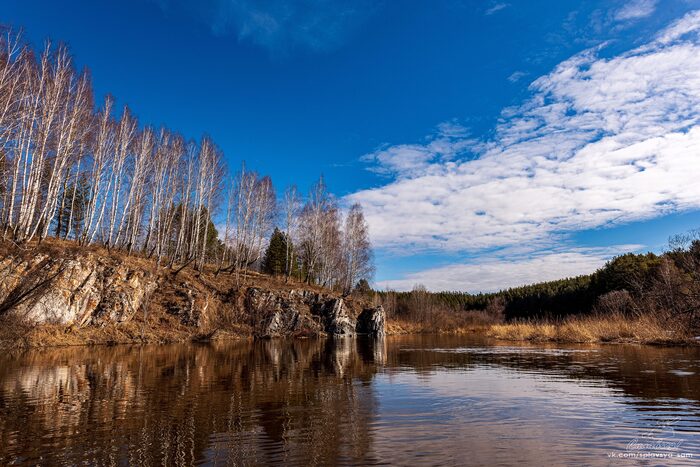 Першино закончилось. Впереди была широкая прямая плёса до самого Чёртова пальца. Осенью она немного помучила нас мелями, сейчас же было глубоко и мы шли в своё удовольствие. Стали появляться цапли и утки. Утки и парами, и небольшими стайками. Ещё абсолютно голые, лишь с пушистыми серёжками кусты тальника абсолютно не загораживали берега. Зелень сосен, жёлто-коричневая серость травы и берегов, слепящие на солнце лоскуты снега, голубое, с белой ватой облаков небо – вот такое великолепие окружало нас.