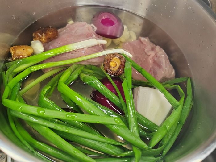 4. Сложим все ингредиенты (кроме дашиды и соевого соуса) для бульона в кастрюлю и поставим на огонь. Пусть закипает.
