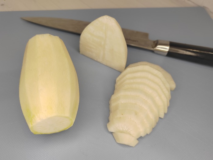 6. Пока варится бульон, займёмся танмуджи. Пошинкуем дайкон. Сначала разрежем пополам, потом порежем на куски толщиной 3 мм.