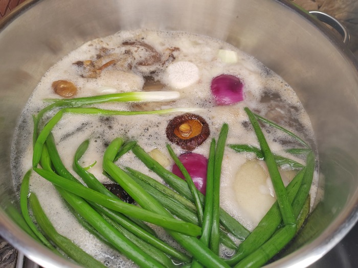 10. Добавляем в бульон соевый соус и приправу дашида. Даём закипеть. Варим ещё полчаса. Вот с соевым соусом я немного факапнулся - дома у меня был только китайский "черный" соус. Поэтому бульон у меня получится цвета Кока-Колы. Был бы привычный соус, бульон был бы ощутимо светлее. А вот правильный гук-ганджан сделал бы бульон ащще золотистым.