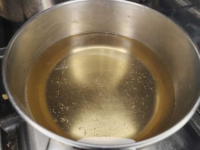 7. Поставим кипятиться воду, добавим соль и сахар. Если вы просто готовите танмуджи (например, в качестве панчана или для приготовления кимпаба), можете добавить в маринад чайную ложку куркумы. Для задорно-желтого цвета.