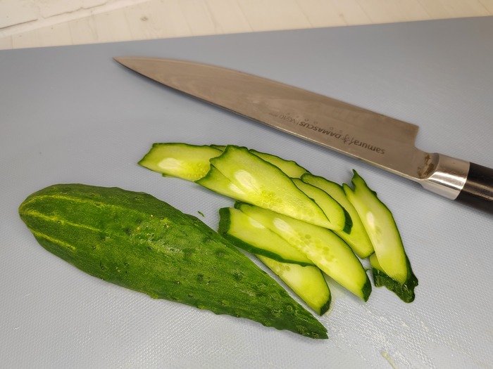 Огурцы (3 шт) нарезаем тоненькими "полу-кружочками", выкладываем в миску, добавляем чайную ложку соли, хорошо перемешиваем, ждём 10 минут и сливаем выделившийся сок.