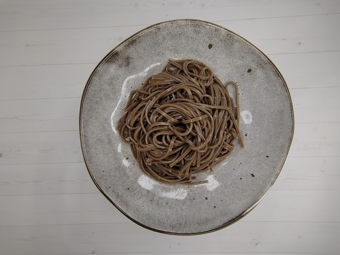 и кидаем в неё лапшу. К сожалению, в Питере я не смог найти корейскую длинную и тонкую гречневую лапшу. Пришлось обходиться стандартной "собой".