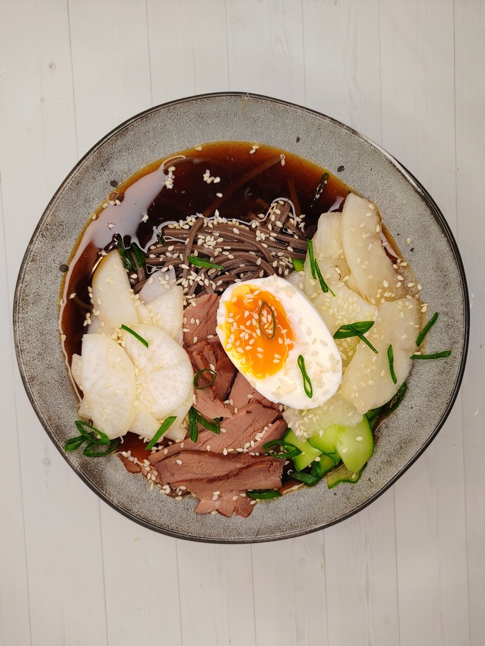 Существует два основных вида нэнмёнов - муль-нэнмён (물냉면) и пибим-нэнмён (비빔냉면). "Муль" - это вода, а "пибим", как я уже когда-то рассказывал - смешивать. Но сегодня мы остановимся на первом из них. На холодноводной лапше.