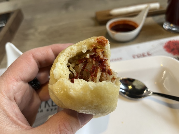 Но вот здесь как раз пегодя, от чего всё это дело пошло. Надкусываем мягкое тесто и добавляем соус Кандяй.