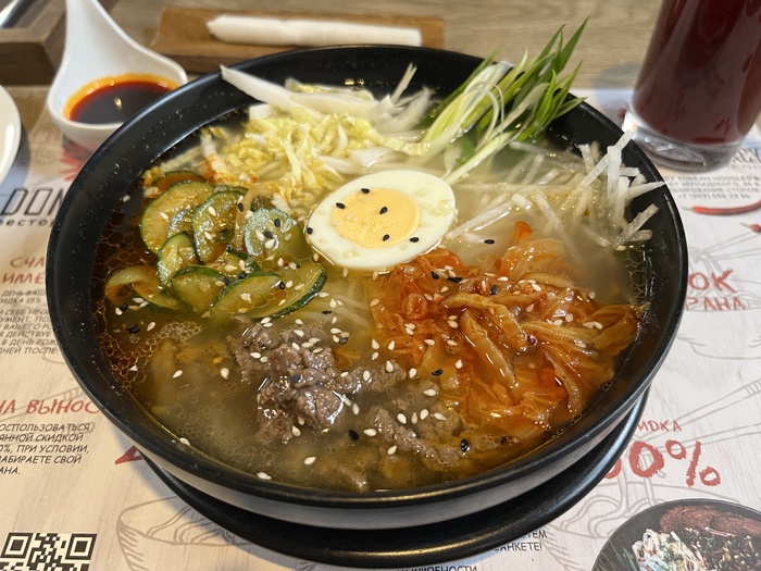 След остался и в сердце. Он мён мне показался великолепным. В отличие от других азиатских супов бульон в нём не создаёт ощущения тяжести – он прозрачный, но при этом обладает собственным вкусовым характером, подхватывая разнообразные нотки от остальных ингредиентов. Прикольно было обнаружить в составе битые огурцы. Да и всё остальное очень в тему, одно дополняет другое до полной гармонии. Лапша – полный восторг, недаром в Доме Куксу ей так гордятся. Это действительно очень хорошая домашняя лапша. Мясо прекрасно... Да всё отлично. Несмотря на солидный объём, съел до последней ложки.