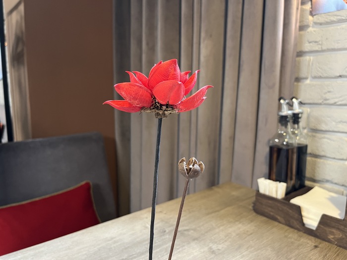 Знаю, что не всем нравится подобный способ ознакомления с ассортиментом, но на этот случай посетителю на выручку приходит официантка, которая поможет сориентироваться и всё подскажет. В этом плане сервис мне показался очень душевным. Девушка Эля, обслуживающая мой стол, была сама доброжелательность. Узнав, что я в Доме Куксу впервые, она принесла и поставила на стол красный цветок. Очень трогательно.