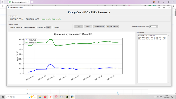 Попросил DeepSeek написать программу, для отслеживания курса валют и что бы в этой программе был график изменений с течением времени. По ходу создания программы, было интересно узнать, что точные бесплатные данные от ЦБ доступны, только в реальном времени, одна неделя, месяц и максимум 3 месяца. Первые попытки приводили к произвольным графикам, независящие от реального курса и истории, почему-то DeepSeek думал, что мне нужен демо режим, а не реальные данные сразу. Программа работает следующим образом: