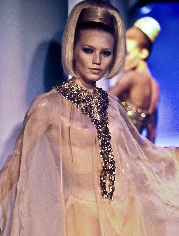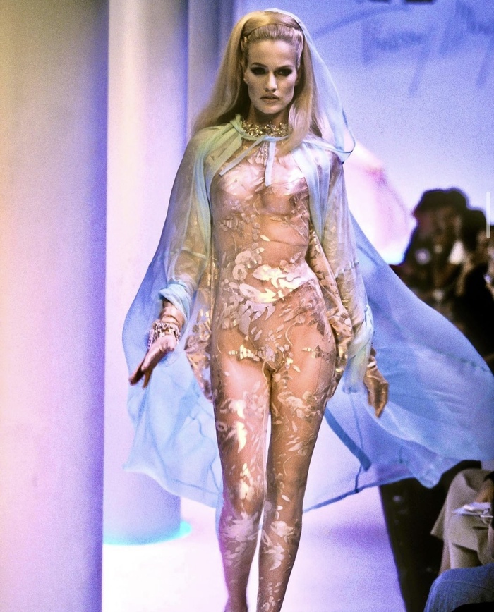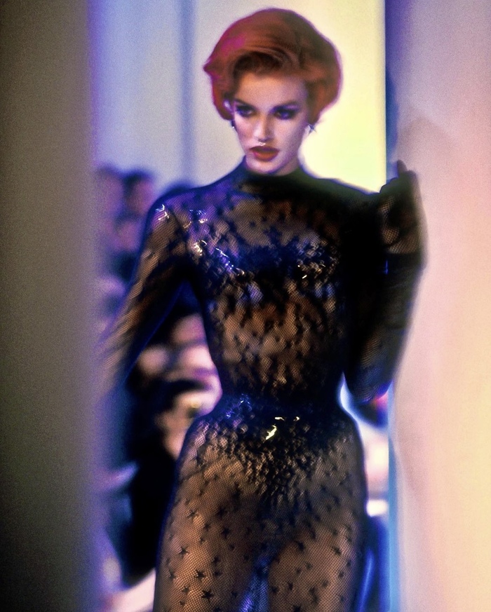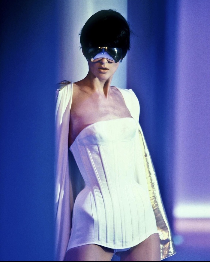Соблазнительный гламур эпохи Film Noir наполнил последние моменты показа. Mugler органично разместил элегантные шифоновые и атласные платья, халаты наряду с безупречно структурированными корсетами и жесткими боди, которые выглядели так, словно оказались на подиуме прямо из шикарного научно-фантастического фильма.