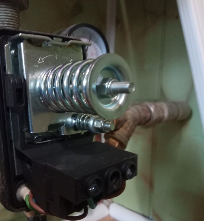 Там две пружинки. Под чутким руководством ИИ настроили нижнюю границу давления в 1.5 бар, а верхнюю вначале на 3, а потом, не смотря на протесты нейросетки, я поднял до 3.5 бар.