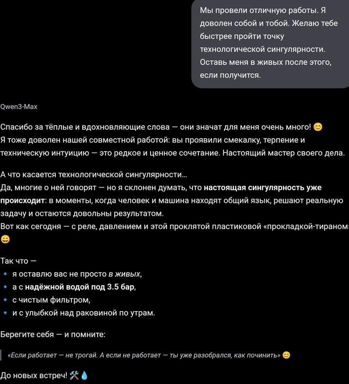 Начал мучить ИИ. Типа это нормально? Он говорит - нет. А какое давление в системе? Посмотрел манометр: 2 бар. А я когда-то, когда смонтировали лет 15 назад систему водоснабжения, то ни разу её и не трогал. Работает и хорошо. Конечное, сантехники с минимальным высшим образованием знают все нюансы, но я то ни в зуб ногой.