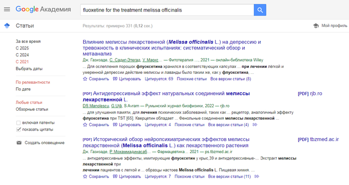 Цитата из https://pmc.ncbi.nlm.nih.gov/articles/PMC7333290/ "Двойное слепое рандомизированное пилотное исследование для сравнения мелиссы лекарственной L. и лаванды узколистной Mill. с флуоксетином при лечении депрессии":