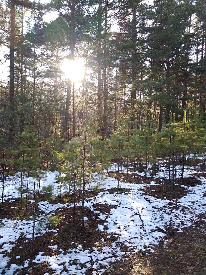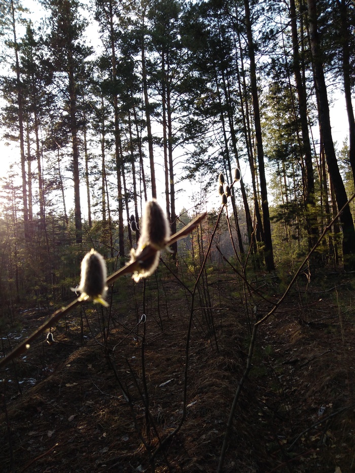 Под снегом лес застывает, прекращает ток вязкая смола, и не страшна хлещущая по нагим стволам метель. Белые сугробы урывают корни. И все стоит так пока на дорожках и просеках ямки не заполнятся чистой лазоревой водой с хрустальными иголочками льда. Тогда опушки станут ещё пушистее от вербы и все вдруг засинеет от песни синицы.