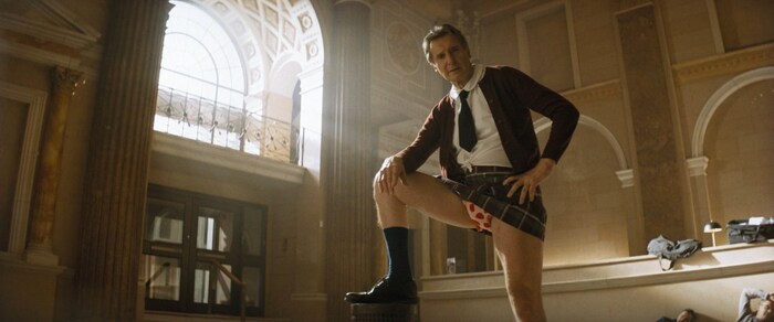 Лиам Нисон. Я в прошлой части много распинался о роли Лесли Нильсена для трилогии – его талант говорить абсурдные вещи с каменным лицом, при этом сохраняя эмоциональность героя, то, вокруг чего крутилась добрая половина шуток фильмов. Лиам Нисон – хороший актёр, но этим умением не обладает. У человека без малого 50 лет драматических серьёзных ролей за спиной, это не его амплуа (да, Лесли Нильсен тоже был изначально драматическим актёром, но ориентироваться на него – это ошибка выжившего). Даже на уровне монологов: монологи Нильсена вызывают смех тем, как они написаны и как он их подаёт, а Нисон воспринимается на серьёзных щах.