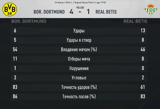 Эти команды в очередной раз подарили нам яркую встречу с обилием голов. Вот только без ничейного результата. Хотя неизвестно, как развивались бы события, если бы не удаление Бернарду Силвы уже на девятой минуте матча. Португалец откровенно срубил Щюррле недалеко от штрафной Боруссии, и судья решил, что этот фол достоин красной карточке. Дортмунд сейчас на ходу, и не трудно было предположить, что в большинстве команда еще агрессивнее станет действовать в атаке. Хотя Монако не привыкать играть в меньшинстве против Боруссии. В прошлом сезоне, при счете 2-0 в пользу немцев, у французов был удален Фабиньо. В итоге, благодаря дублю Вагнер Лава, встреча завершилась вничью, 2-2. Но сегодня удача была явно на стороне гостей. Особенно выдающуюся встречу провел Кастро. Именно он на 15-ой минуте совершил отбор в центре поля и начал первую голевую атаку. Мяч от него получил Щюррле и выверенным пасом вывел на ударную позицию Вайгеля. А тот, в свою очередь, умедрился из выгоднейшей позиции попасть в штангу. Но, как я уже говорил, Боруссии в этот вечер фартило по максимуму. Мяч от штанги отскочил точно к Обамеянгу, которому не составило труда добить его в пустые ворота. Не прошло и пяти минут, как гости соорудили еще одну голевую атаку. Кастро на этот раз сам убежал один на один с голкипером и элегантным «черпачком» перекинул бросившегося на перехват Субашича. Но и это было не все. Еще пять минут потребовалось немецкой команде, чтобы забить третий гол. И вновь отличился Кастро. Сперва он точной передачей нашел в штрафной Монако Обамеянга. Форвард принял мяч, мгновенно развернулся и «шведой» пробил в ближний угол. Субашич с прыжком опоздал, но мяч угодил в штангу и отскочил вдоль лицевой линии, собираясь уйти в аут. Однако, Ройс не позволил ему это, первым же касанием вернув круглого в штрафную, где на линии вратарской уже стоял абсолютно один Кастро, который шикарным ударом через себя вколотил снаряд под перекладину. На этом Боруссия решила временно успокоиться и даже позволила Монако отквитать один мяч. Защитники немецкой команды решили сыграть, как в первых турах, в результате чего Мбаппе без помех вошел в штрафную Бюрки и закатил мяч в ворота. Второй тайм получился менее богатым на события. Уже на 57-ой минуте установился окончательный счет в матче. Кастро продолжал властвовать в центре поля. Вместе с Ройсом они отобрали мяч у зазевавшегося Фабиньо и вывели на ударную позицию Обамеянга. И вновь первый удар форварда отразил голкипер. И вновь мяч отскочил к нападающему Боруссии. Монако имело несколько неплохих шансов сократить отставание в счете, но не воспользовалось ими. А под занавес встречи травму получил Ройс. Пока неизвестно, на сколько он выбыл из строя, но ясно, что это ощутимая потеря.