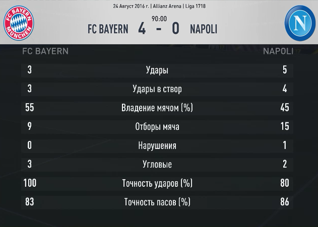 Учитывая статистику личных встреч, Рома была вправе рассчитывать на то, чтобы сравняться по очкам с Баварией. Тем более, прошлый свой матч римляне выиграли. Встреча с мюнхецами прошла почти по такому же сценарию, что и с неаполитанцами. Вот только роль Наполи играла сама Рома. Уже на четвертой минуте атака Баварии левым флангом завершилась точным ударом Видаля. И в дальнейшем атаковали в основном гости. Удары Наингголана, Перотти, Де Росси были хороши, но не настолько, чтобы с ними не справился Нойер. Немецкий голкипер безупречно провел эту встречу и был одним из лучших на поле. Однако, на 50-ой минуте он был готов капитулировать перед ударом головой Джеко с убойной позиции, но мяч угодил в перекладину. Бавария, в свою очередь, предпочитала брать не количеством, а качеством. Их немногочисленные атаки всегда доводились до удара, причем с близкого расстояния. В ходе одной из таких атак, когда играть оставалось минут десять, Левандовски наконец-то смог выскочить один на один с голкипером и лишить Рому надежды на ничью. Так Бавария одержала первую победу над Ромой в рамках Лиги FAVORIT.