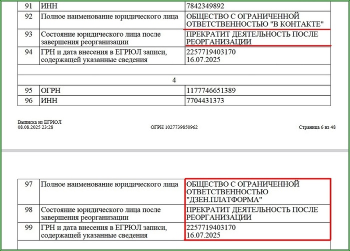 Один из авторов Дзена недавно откопал интересную информацию — официальную выписку из ФНС, в которой говорится, что юридические лица «Дзен» и «ВКонтакте» ликвидируются в связи с реорганизацией. В общем, юридически этих компаний больше нет.
