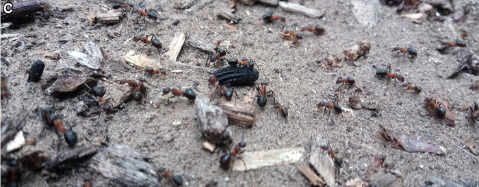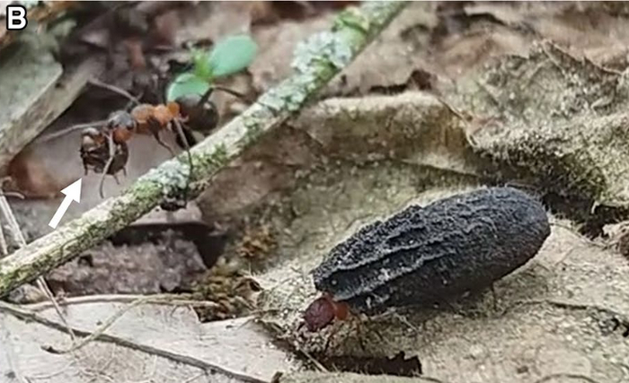 Автор отдельно указывает на переноску одного маленького муравья более крупным сородичем (указано стрелкой). Такое можно часто увидеть при переезде улья. Мелкий муравей сворачивается в особую позу и его легко зацепить мандибулами.