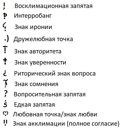 Восклимационная запятая/восклицательная запятая --- нужна для того, чтобы выразить восклицание, но не заканчивать предложение --- использование: !, Интерробанг --- нужен для выражения шока или недоверия --- использование: ?! или ‽ Знак иронии --- нужен для выражения иронии или сарказма в конце предложения, может считаться с другими знаками --- использование: ?ир. или (?) или ⸮ Дружелюбная точка --- нужна для выражения дружественности в конце предложения, довольно современный сленг, хотя оказывается существует уже около 550 лет --- использование: .) Знак авторитета --- нужен для выражения важности и серьёзности данного предложения, а также для выражения авторитета его автора --- использование: !ав. или (!) Знак уверенности --- если вы полностью уверены в том, что написали, считаете, что это однозначная правда и хотите это подчеркнуть -- этот знак для вас --- использование: -!- или !ув. или {!} Риторический знак вопроса --- задавая риторический вопрос в тексте, правильней будет поставить этот знак, а не обычный вопросительный --- использование: {?} или ?ритор. или ¿ Знак сомнения --- сомневаясь в написанном тексте, правильно будет поставить этот знак, он даст читателю понять, что вы не уверенны в правдивости высказывания --- использование: 3? или {?} Вопросительная запятая --- то же самое, что и с восклимационной/восклицательной запятой -- вопрос, не заканчивающий предложение --- использование: ?, Едкая точка/запятая --- нужна для язвительных, саркастических или, наоборот, шуточных замечаний --- использование: [.едк] или 3. или {.} Любовная точка/знак любви --- практического смысла не имеет, лишь выражает чувства автора к читателю или герою, чаще всего использовалось для любовных посланий, но иногда бывало и в старых книгах --- использование: <3. или ♥ Знак аккламации --- полное согласие, одобрение, однозначное согласие похожее на аплодисменты --- использование: !! или !.